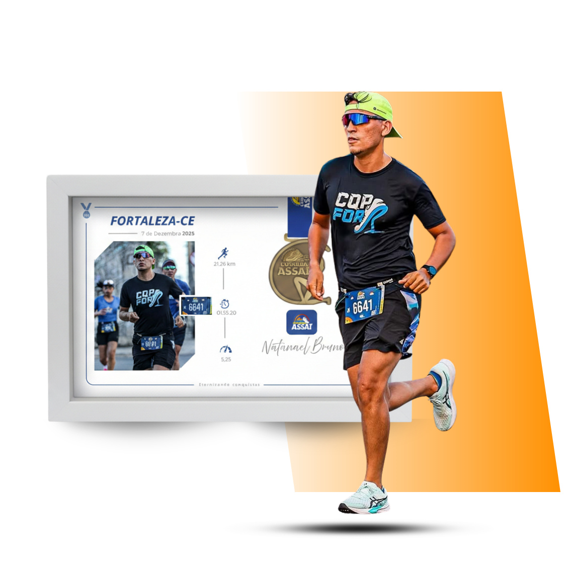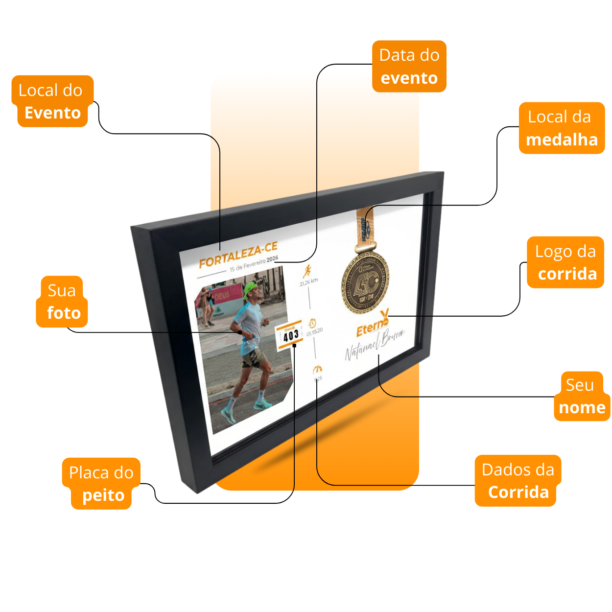 Sim. Você pode escolher a foto, adicionar os detalhes da prova (nome, data, tempo, distância) e deixar o layout do quadro exatamente do jeito que deseja.